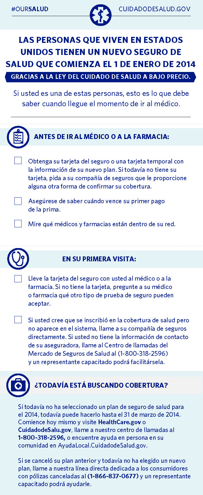 Si usted es una de las muchas personas que viven en Estados Unidos que se inscribieron en la cobertura de salud que comienza el 1 de enero de 2014, lea estos consejos sobre qué hacer la primera vez que vaya al médico o a la farmacia.