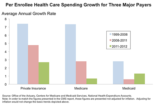 Asimismo, la inflación en los precios de los servicios médicos como se miden en la Oficina del Estadista, disminuyó, de lo que ya eran niveles bajos, de un 2.4% en 2011 a un 1.7% en 2012. Según el informe de la CEA, la inflación en el precio de los servicios de salud medida usando la información sobre precios del Departamento de Análisis Económicos (que está disponible desde hace mucho tiempo) ha alcanzado el nivel más bajo en 50 años.