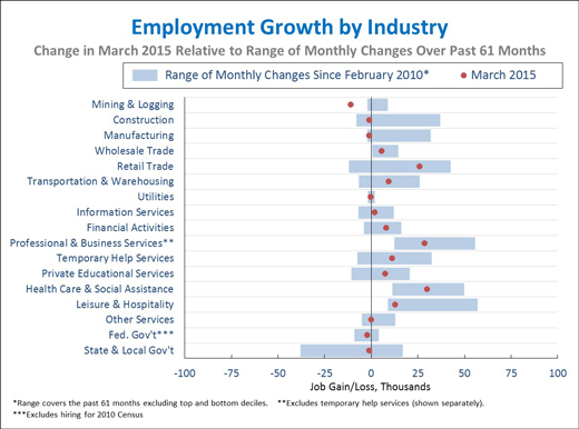 5. Job growth in a number of industries fell below recent trends in March. Looking over the 61-month streak of private-sector job growth, March was an especially weak month for mining and logging (-11,000), manufacturing (-1,000), leisure and hospitality (+13,000), and construction (-1,000). The weakness in mining and logging is likely attributable in large part to the recent decline in oil prices. March was a stronger than usual month in retail trade (+26,000) and health care and social assistance (+30,000). Across the 17 industries shown below, the correlation between the most recent one-month percent change and the average percent change over the last twelve months rose to 0.51 from 0.13 last month, remaining somewhat below the average correlation over the past two years.
