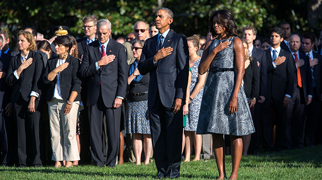 The President, The First Lady, and White House staff observe a moment of silence to mark the 14th anniversary of the 9/11 attacks South Lawn Pooled Press Pre-set 8:00AM; Final Gather 8:25AM – North Doors of the Palm Room |