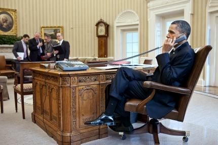 President Barack Obama talks on the phone in the Oval Office with Homeland Security Secretary Janet Napolitano and Federal Emergency Management Agency Administrator Craig Fugate regarding the earthquake in Japan and the tsunami warnings across the Pacific, March 11, 2011. Listening in the background, from left, are: Assistant Press Secretary Nick Shapiro, Assistant to the President for Homeland Security John Brennan; Richard Reed, National Security Staff Senior Director for Resilience; and Daniel Russel, National Security Staff Director Asian Affairs. (Official White House Photo by Pete Souza)
