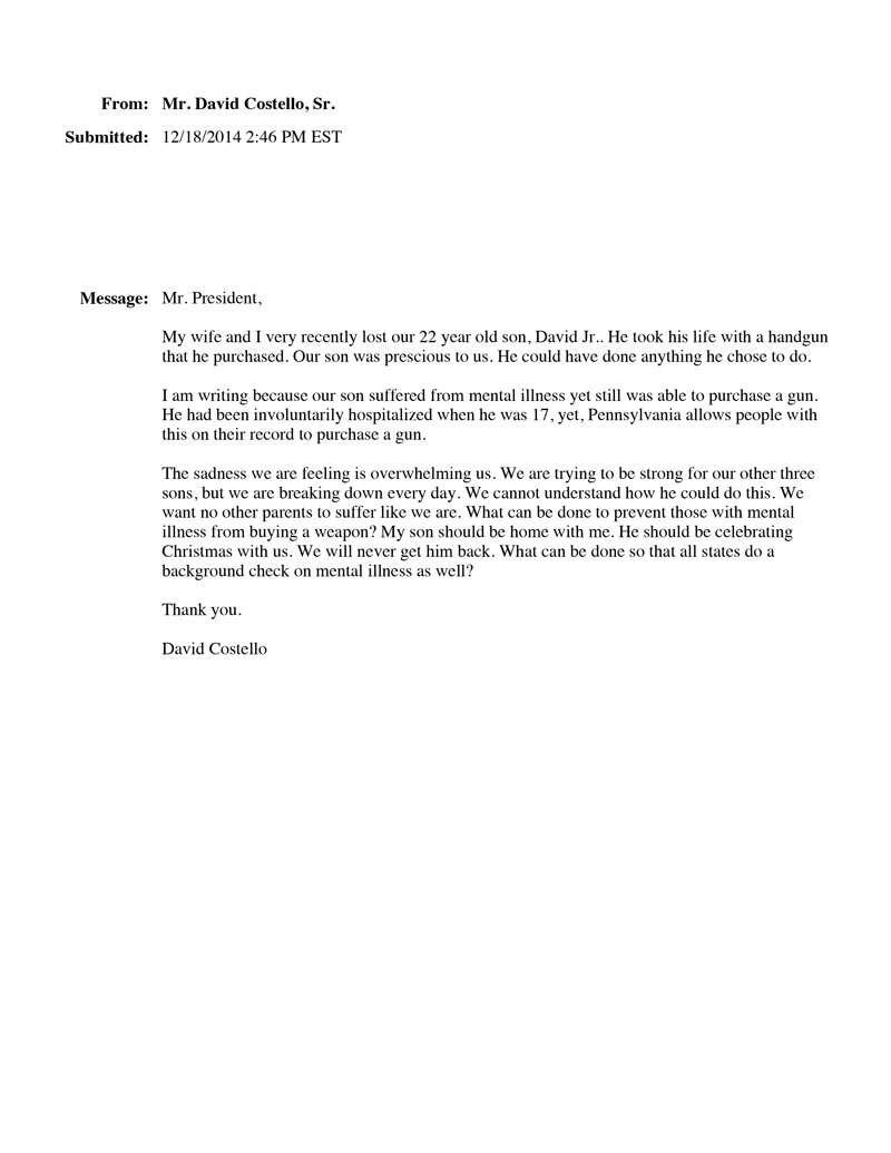 I am writing because our son suffered from mental illness yet still was able to purchase a gun. He had been involuntarily hospitalized when he was 17, yet, Pennsylvania allows people with this on their record to purchase a gun.