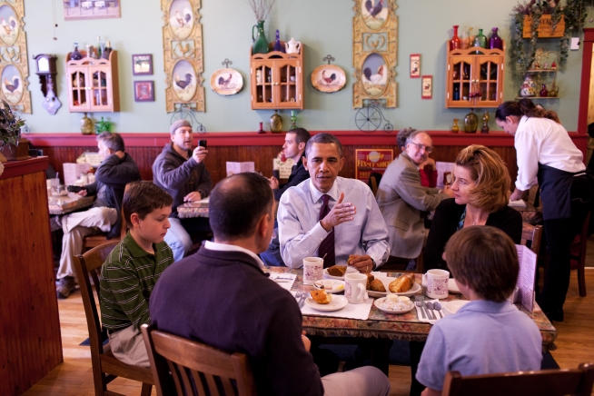 President Barack Obama makes a local stop at Julien's Corner Kichen in Manchester, New Hampshire, Nov. 22, 2011, to sit-down with the Corkery family to discuss the importance of extending and expanding the payroll tax cut. Chris Corkery is a retired colonel, having served 26 years in the United States Army. Chris has been a math teacher at Manchester Central High School for the past 12 years. His wife, Kathy, a small business owner, and their two sons, Andrew and Nicholas attended. (Official White House Photo by Pete Souza)