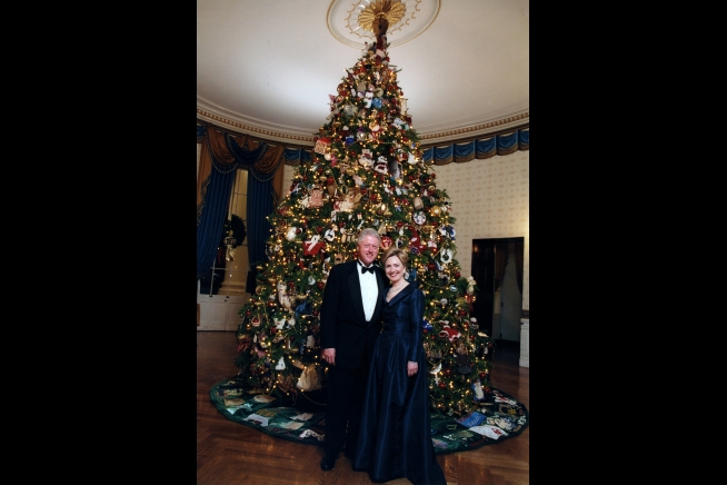 President William J. Clinton and First Lady Hillary Clinton stand in front of the White House Christmas tree in the Blue Room, December 3, 2000