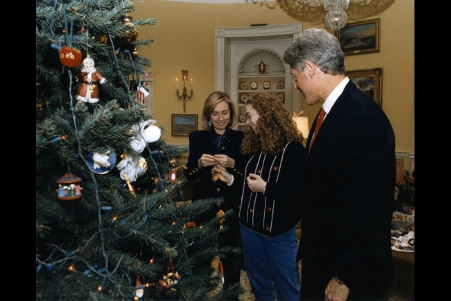 President William J. Clinton and the First Family decorate their Christmas tree in the Yellow Oval Room