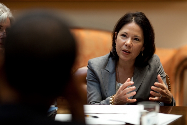 President Barack Obama is briefed by Nancy-Ann DeParle, director of the White House Office for Health Reform, during a health care meeting in the Roosevelt Room of the White House, June 18, 2009. ( Official White House Photo by Pete Souza)