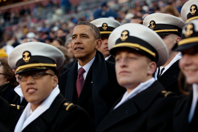 President Barack Obama watches the first half of the annual Army vs. Navy football game with U.S. Naval Academy Midshipman at FedEx Field, Landover, Md., Dec. 10, 2011.