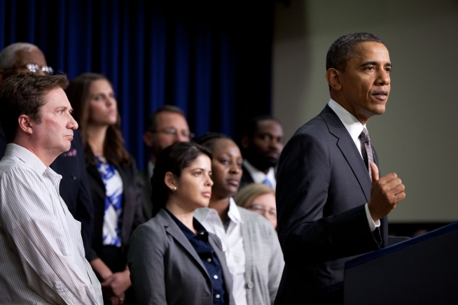 President Barack Obama delivers remarks on the impasse in Congress over the payroll tax cut extension during a statement in the South Court Auditorium of the Eisenhower Executive Office Building, Dec. 22, 2011. (Official White House Photo by Pete Souza)