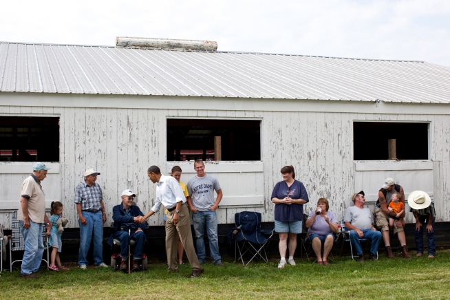"To me, it's sometimes more interesting to see a wider view of a scene like this than you might see published in most newspapers. Here the President greets people at the Whiteside County Fair in Morrison, Ill., during his bus tour."
