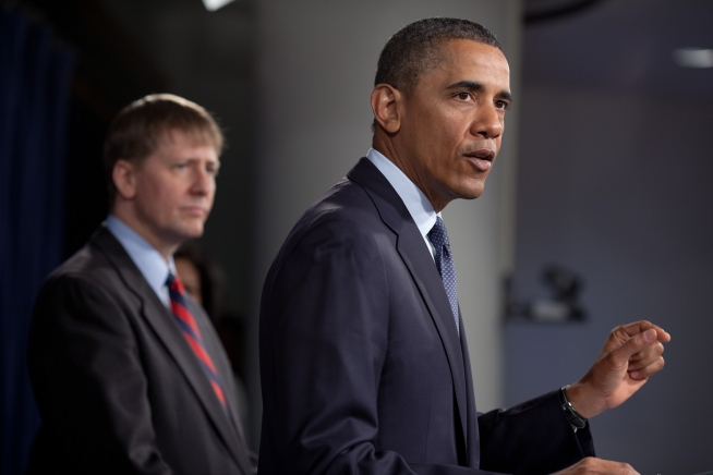 President Barack Obama delivers remarks at the Consumer Financial Protection Bureau in Washington, D.C., Jan. 6, 2012. CFPB Director Richard Cordray, left. (Official White House Photo by Pete Souza)