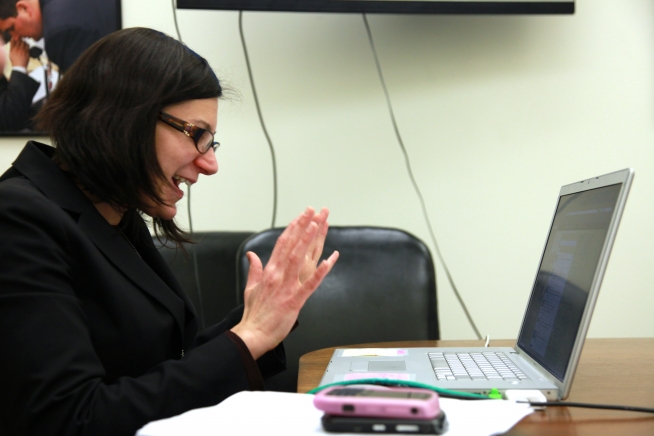 Christine Koronides celebrates her first Tweet for SOTU Twitter Office Hours, answering questions about small business. [Photo by Joanna Zhang].