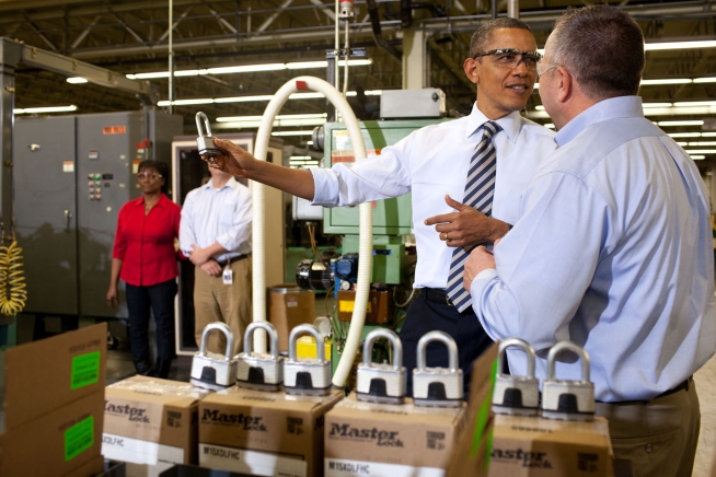 President Barack Obama tours Master Lock Company with Bob Rice, Senior Vice President for Global Supply Chain/Product Development of Master Lock, in Milwaukee, Wis., Feb. 15, 2012. The President highlighted Master Lock in his State of the Union address as an example of a company moving jobs back to the U.S. (Official White House Photo by Pete Souza)
