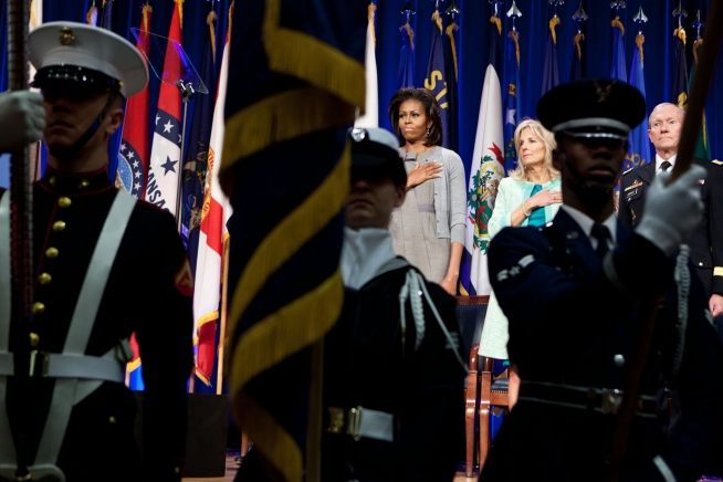 First Lady Michelle Obama, Dr. Jill Biden, and Gen. Martin Dempsey, Chairman of the Joint Chiefs of Staff, stand for the national anthem at the Pentagon in Arlington, Va., Feb. 15, 2012. The First Lady and Dr. Biden joined Gen. Dempsey, Defense Secretary Leon Panetta, and Neal Wolin, Deputy Secretary of the Treasury, to unveil a new report outlining opportunities and best practices for states to better support military spouses serving in professions with state licensure requirements. (Official White House Photo by Chuck Kennedy)