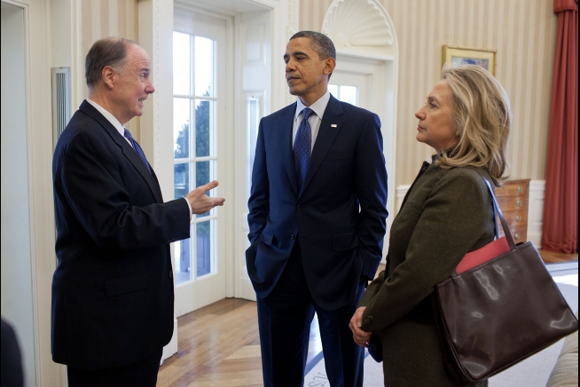 President Barack Obama talks with National Security Advisor Tom Donilon and Secretary of State Hillary Rodham Clinton in the Oval Office, March 5, 2012. (Official White House Photo by Pete Souza)