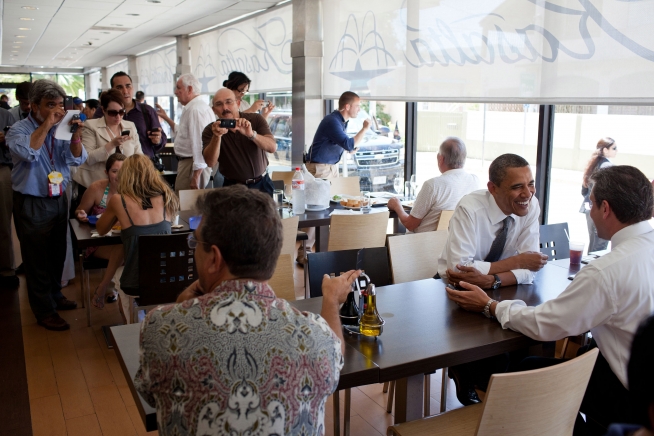 President Barack Obama talks with Puerto Rican Senator Alejandro Garcia Padilla during a lunch stop at Kasalta, a restaurant in the Ocean Park neighborhood of San Juan, Puerto Rico, June 14, 2011. (Official White House Photo by Pete Souza)