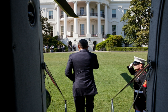 President Barack Obama exits Marine One on the South Lawn of the White House following a trip to Fort Stewart, Ga., April 27, 2012. (Official White House Photo by Pete Souza)