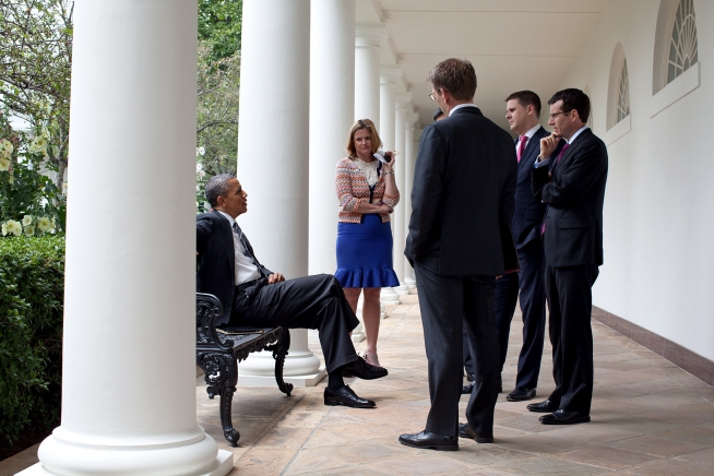 President Barack Obama talks with staff along the Colonnade of the White House, June 5, 2012. Pictured, clockwise from the President, are: Jennifer Palmieri, Deputy Director of Communications; Chief of Staff Jack Lew; Dan Pfeiffer, Director of Communications; Senior Advisor David Plouffe; and Press Secretary Jay Carney. (Official White House Photo by Pete Souza)