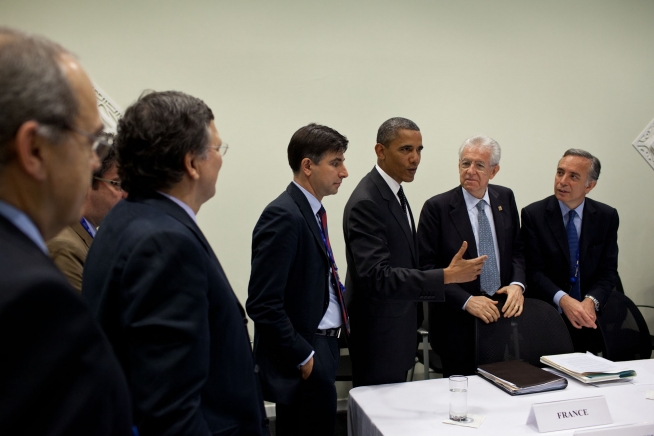 President Barack Obama talks with leaders at the conclusion of a Eurozone meeting at the Los Cabos Convention Center in Los Cabos, Mexico, June 19, 2012. (Official White House Photo by Pete Souza)