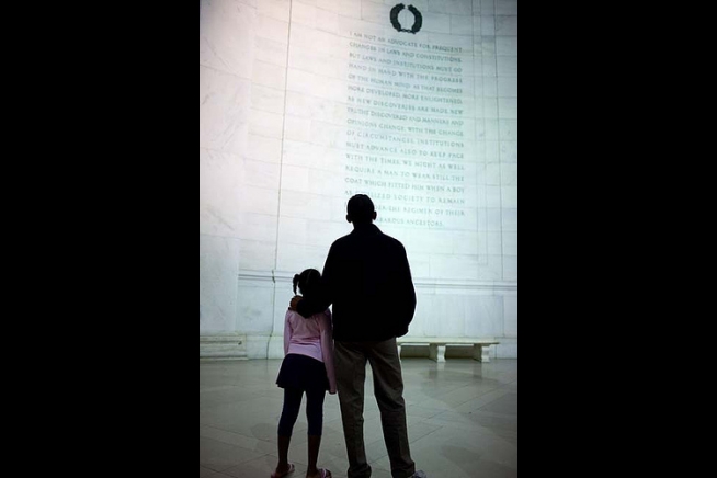 The President and his daughter Sasha read one of Thomas Jefferson’s speeches at the Jefferson Memorial one Sunday night in Washington, D.C. The entire family toured the Memorial and later the Washington Monument.
