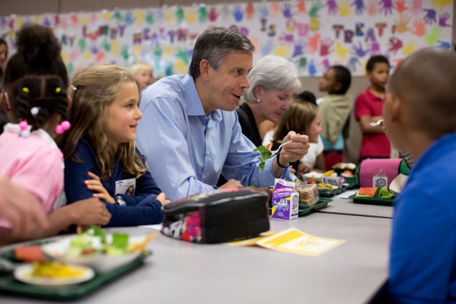 Education Secretary Arne Duncan and Health and Human Services Secretary Kathleen Sebelius join students for lunch during a visit at Lowry Elementary School in Denver, Colo., Sept. 17, 2012. Sec. Duncan and Sec. Sebelius visited the school to tout the school's approach to wellness and to highlight the importance of healthy eating and maintaining an active lifestyle. (Official White House Photo by Chuck Kennedy)