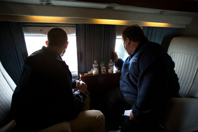 President Barack Obama and New Jersey Gov. Chris Christie look at storm damage along the coast of New Jersey on Marine One, Oct. 31, 2012. (Official White House Photo by Pete Souza)