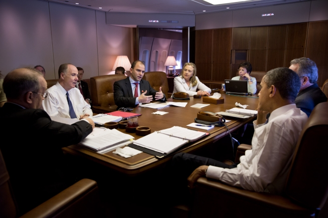 President Barack Obama meets with advisors aboard Air Force One during the flight from Bangkok, Thailand en route to Rangoon, Burma, Nov. 19, 2012. From left are: Danny Russel, Senior Director for Asian Affairs; National Security Advisor Tom Donilon; Ben Rhodes, Deputy National Security Advisor for Strategic Communications; Secretary of State Hillary Rodham Clinton; Senior Advisor Valerie Jarrett; and Kurt Campbell, Assistant Secretary of State for East Asian and Pacific Affairs. (Official White House Photo by Pete Souza)