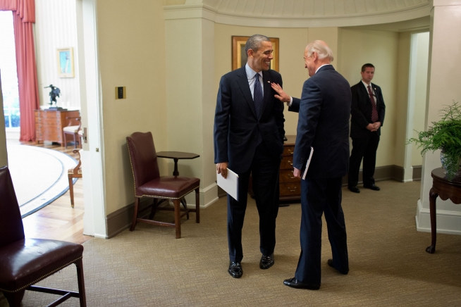President Barack Obama talks with Vice President Joe Biden in the hallway outside of the Oval Office following a meeting, Nov. 26, 2012. (Official White House Photo by Pete Souza)