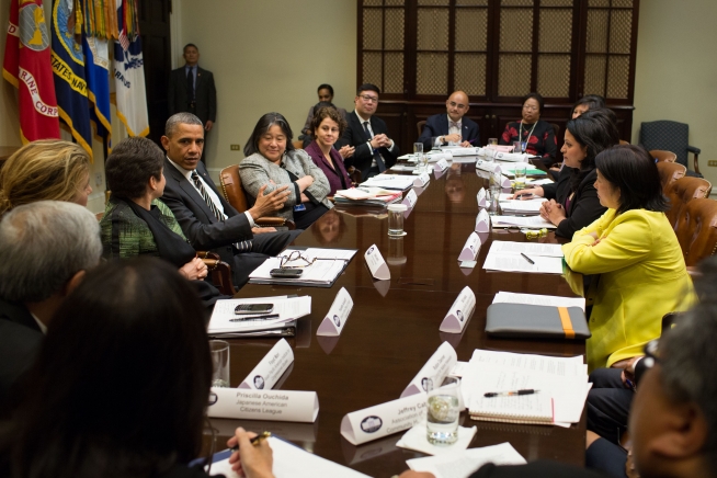President Barack Obama meets with Asian American and Pacific Islander national leaders in the Roosevelt Room of the White House, May 8, 2013.
