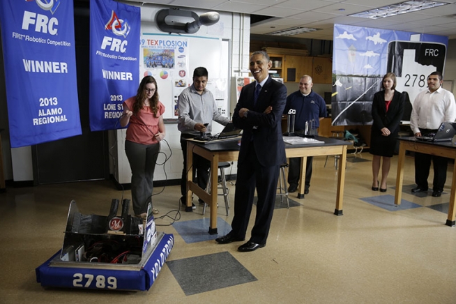 President Barack Obama views student projects, including a robot demonstration, during a classroom tour at Manor New Technology High School in Manor, Texas, May 9, 2013.