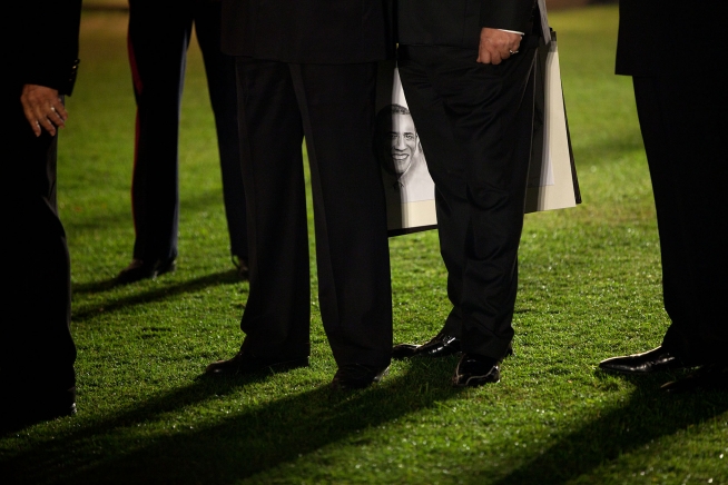 A member of the Indian delegation carries a print of President Barack Obama at the State Dinner at Rashtrapati Bhavan, the presidential palace, in New Dehli, India, Nov. 8, 2010. (Official White House Photo by Pete Souza)