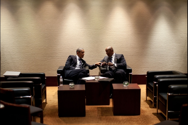 President Barack Obama talks with U.S. Trade Representative Ambassador Ron Kirk before bilateral meetings at the Grand Hyatt Hotel in Seoul, South Korean, Nov. 11, 2010. (Official White House Photo by Pete Souza)