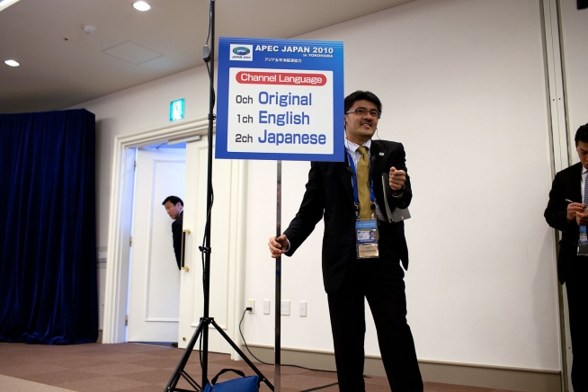 APEC officials watch as President Barack Obama and Prime Minister Naoto Kan of Japan make a statement to the press at the InterContinental Yokohama Grand Hotel in Yokohama, Japan, Nov. 13, 2010. (Official White House Photo by Pete Souza)