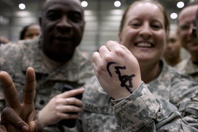 A U.S. soldier shows off President Barack Obama's signature on her hand at Bagram Air Field in Afghanistan, Dec. 3, 2010. (Official White House Photo by Pete Souza)