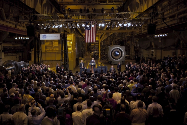 President Barack Obama delivers remarks at the General Electric plant in Schenectady, N.Y., Jan. 21, 2011. With the President is with GE CEO Jeffrey Immelt, who he appointed to chair the new Council on Jobs and Competitiveness. (Official White House Photo by Lawrence Jackson)