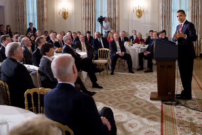 President Barack Obama addresses a bipartisan group of governors in the State Dining Room at the White House in Washington,