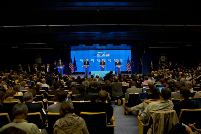 President Barack Obama participates in a joint news conference with EU Council President Herman Van Rompuy and EU Commission President Jose Manuel Barroso at the EU-US summit meeting at the EU Council building in Brussels, Belgium, March 26, 2014. (Official White House Photo by Lawrence Jackson)