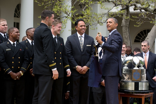 Midshipmen Matt Aiken and Cody Peterson, with Coach Ken Niumatalolo, present President Barack Obama with a Naval Academy jumbo paperweight ring during the Commander in Chief's Trophy presentation ceremony for the U.S. Naval Academy football team in the Rose Garden of the White House, April 18, 2014. (Official White House Photo by Pete Souza)