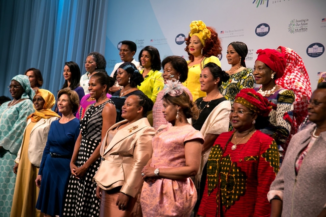 First Lady Michelle Obama and former First Lady Laura Bush pose for a group photo with Africa leader spouses prior to a symposium on advancement for women and girls in Africa at the John F. Kennedy Center for the Performing Arts in Washington, D.C., Aug. 6, 2014. (Official White House Photo by Amanda Lucidon)
