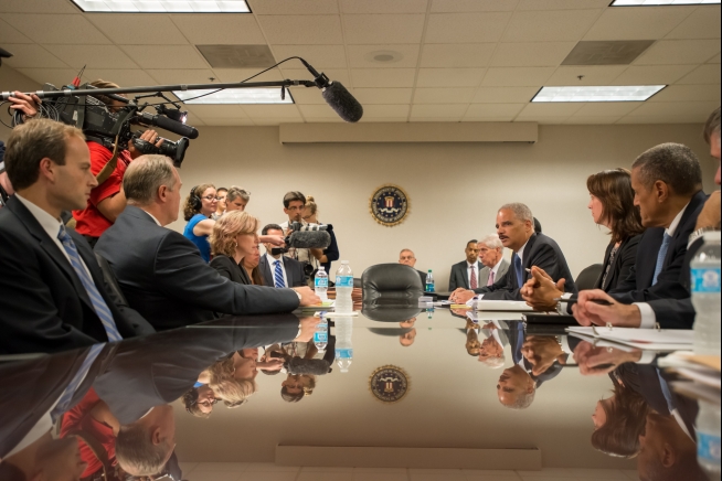 Attorney General Holder receives a briefing at the local FBI headquarters on the ongoing independent civil rights investigation into the shooting of Michael Brown