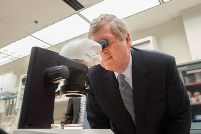 Agriculture Secretary Tom Vilsack looks into a microscope. (Photo credit: U.S. Department of Agriculture)