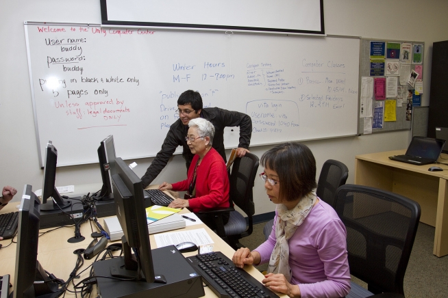 Luis Rios helps Gui Ying Lee and Shuo Chau Yang enroll in the Health Insurance Marketplace