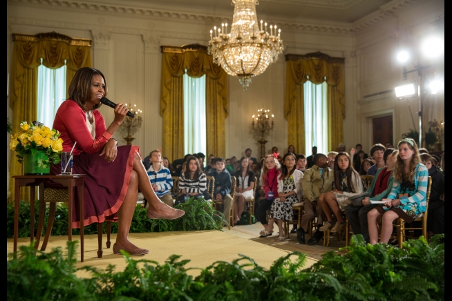 First Lady Michelle Obama answers questions from children at the White House's annual Take Our Daughters and Sons to Work Day
