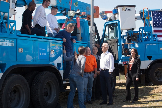 Vice President Joe Biden and Oakland Mayor Libby Schaaf talk to workers at Pacific Gas and Electric, in Oakland, California.