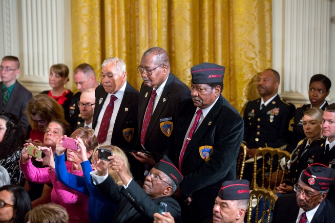 Members of the 369th Infantry Regiment Veterans Association stand as President Barack Obama awards the Medal of Honor posthumously to Army Private Henry Johnson for conspicuous gallantry during World War I, at a ceremony in the East Room of the White House, June 2, 2015.
