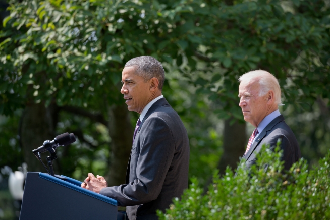 President Barack Obama, with Vice President Joe Biden, delivers a statement on Cuba in the Rose Garden of the White House, July 1, 2015.