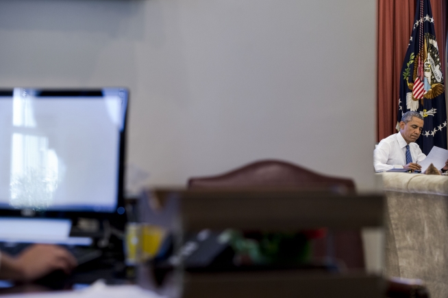 President Barack Obama works on his Iran nuclear deal speech in the Oval Office as Ben Rhodes, Deputy National Security Advisor for Strategic Communications, is reflected on a computer screen working on the speech at a desk in the Outer Oval Office, Aug. 5, 2015. (Official White House Photo by Pete Souza)