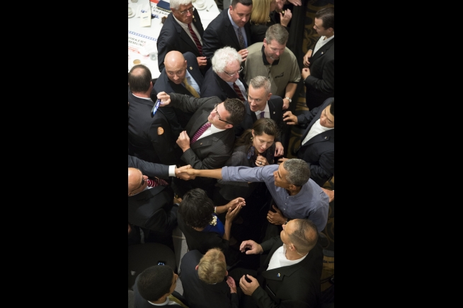 President Barack Obama shakes hands with audience members after delivering remarks at the Boston Labor Day Breakfast in Boston, Mass., Sept. 7, 2015. (Official White House Photo by Pete Souza)