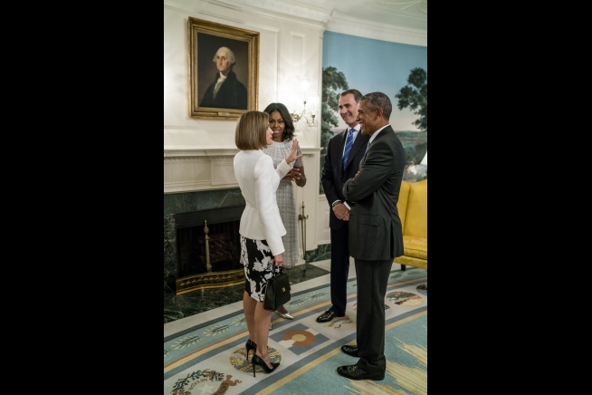 President Barack Obama and First Lady Michelle Obama greet King Felipe VI and Queen Letizia of Spain in the Diplomatic Reception Room of the White House, Sept. 15, 2015. (Official White House Photo by Pete Souza)