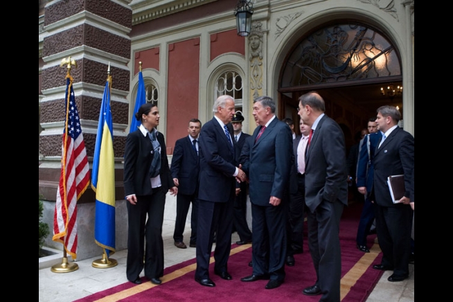 Vice President Joe Biden says goodbye on the steps of Konak after a meeting with the Bosnian Tri-Presidency in Sarajevo, Bosnia & Herzegovina, Tuesday, May 19, 2009.