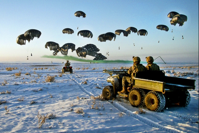 U.S. Army soldiers in four-wheel vehicles wait as bundles of fuel are air delivered by a C-17 Globemaster III to Forward Operating Base Waza K'wah in Paktika province, Afghanistan, Jan. 30, 2011. The soldiers are assigned to the 101st Airborne Division's 4th Brigade Combat Team. Courtesy photo.